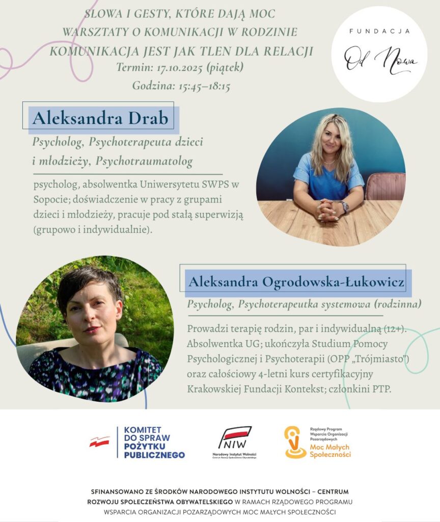 Pierwsze warsztaty zostały przeprowadzone przez Panią Aleksadrę Ogrodowską – Łukowicz – psychologa, psychoterapeutkę oraz Panią Aleksadnrę Drab – psychologa, psychoterapeutkę dzieci i młodzieży, psychotraumatologa – pn. “Słowa i gesty które dają moc. Warsztaty o komunikacji w rodzinie”. Uczestnicy brali udział w ćwiczeniach m.in.